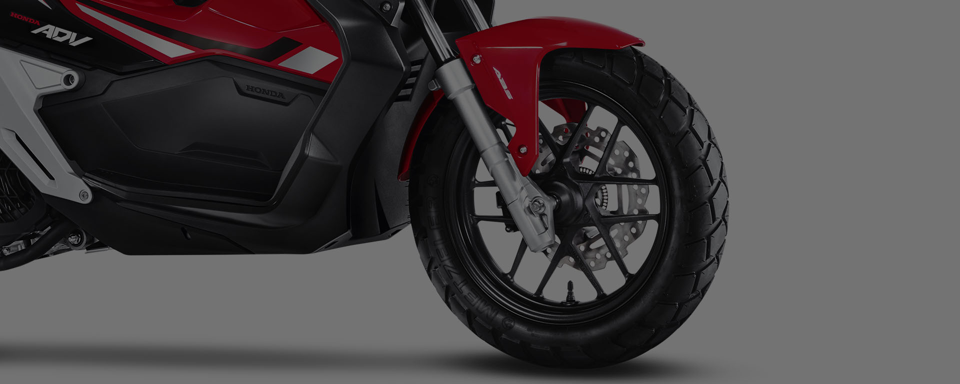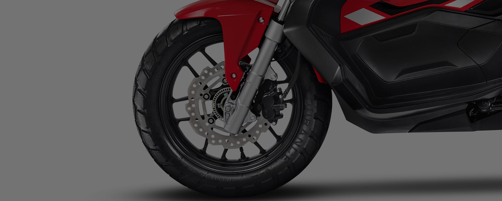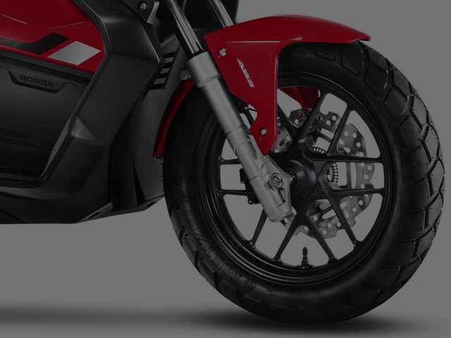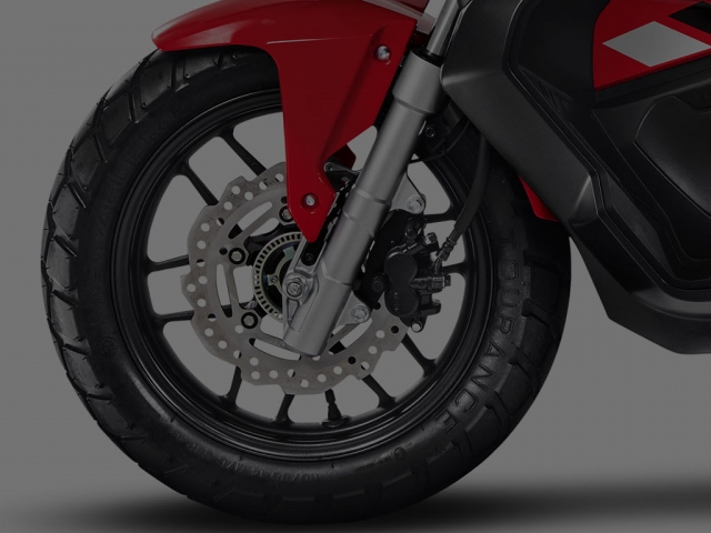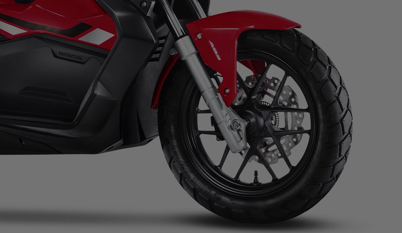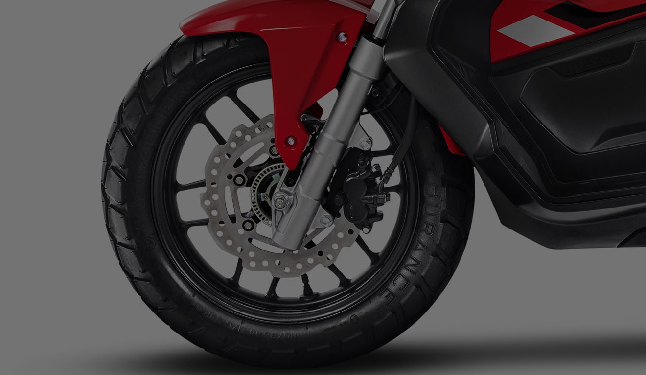 Mais segurança, controle e equilíbrio para você. O freio da Honda ADV possui o sistema ABS, que evita o travamento da roda dianteira no caso de frenagens bruscas. No asfalto ou na estrada de chão: com 14” na roda dianteira e 13” na roda traseira, os pneus da Honda ADV são mais largos e de uso misto, o que proporciona agilidade, estabilidade e segurança mesmo em terrenos irregulares.