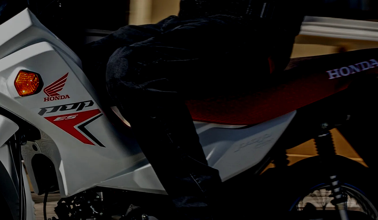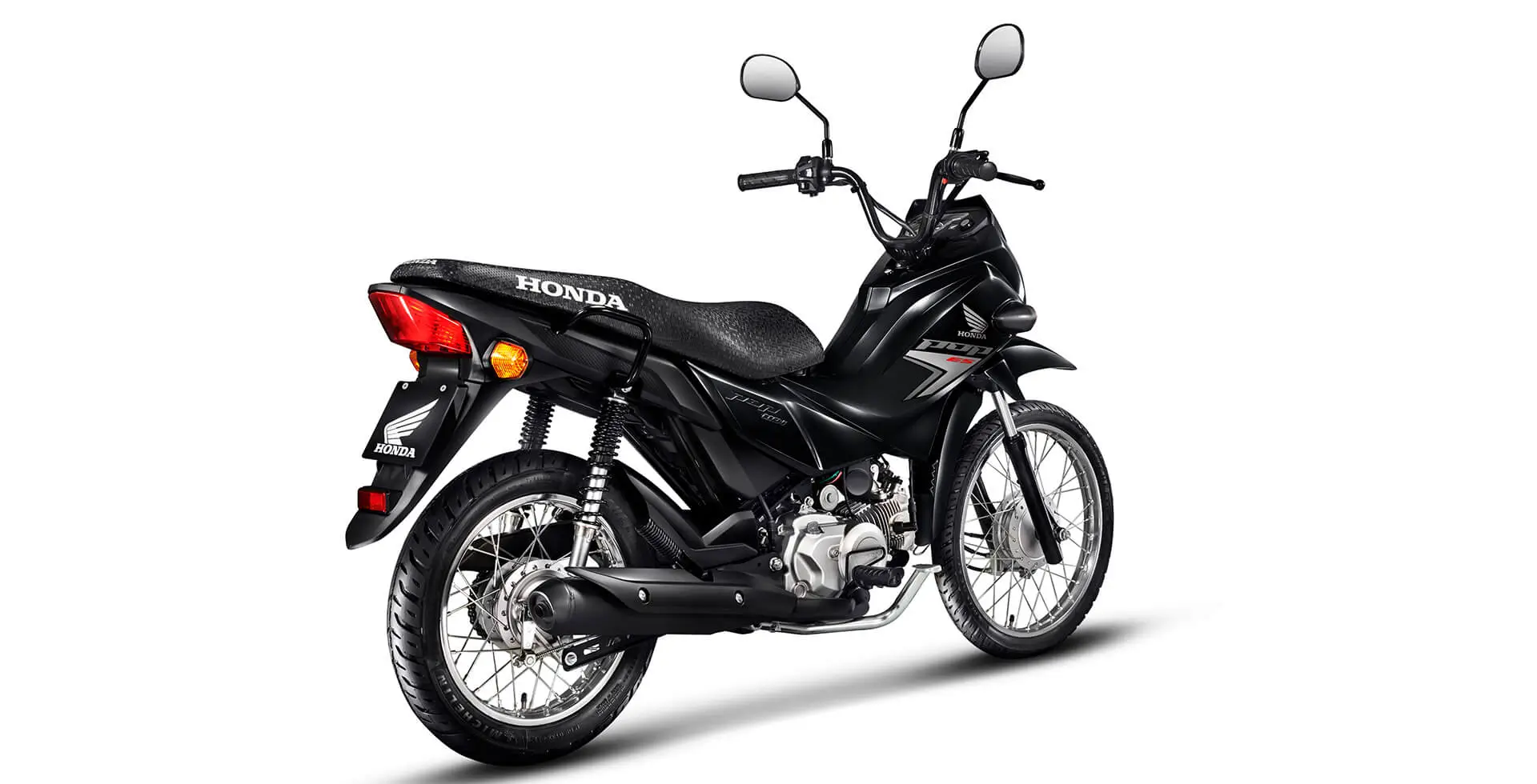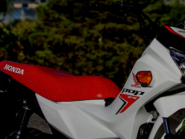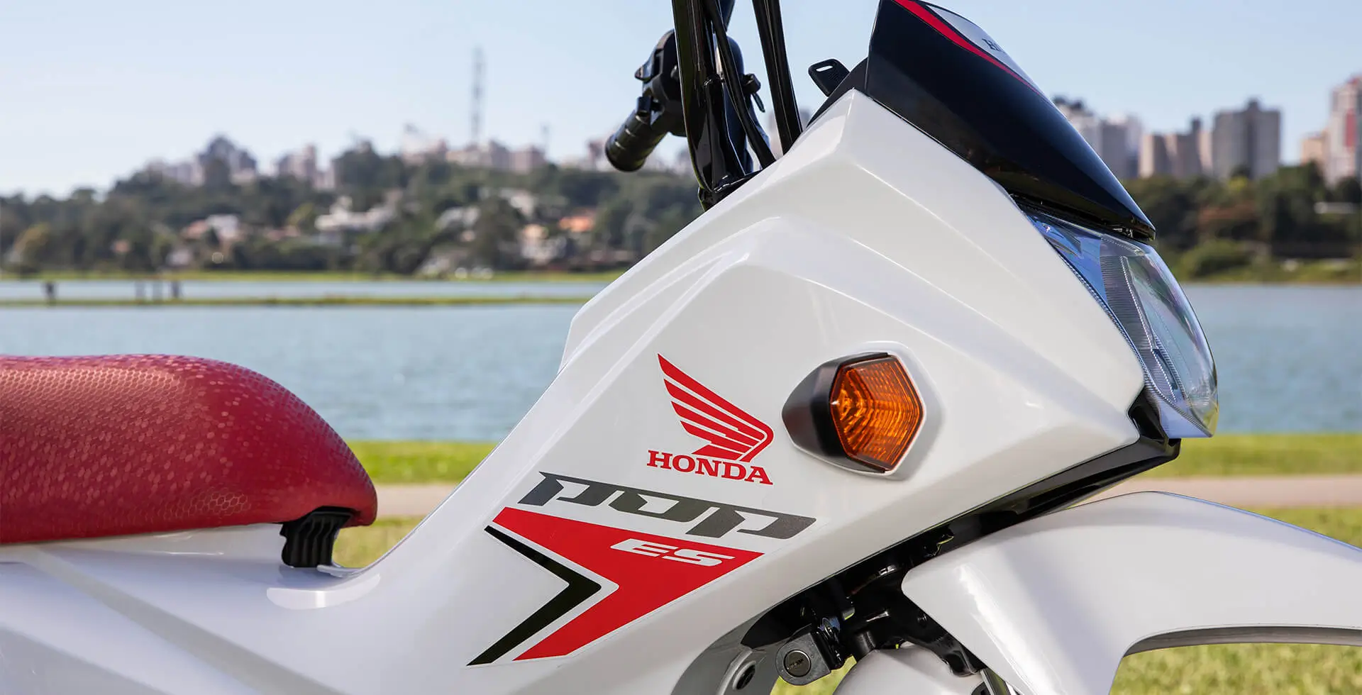O assento largo da Pop torna a pilotagem mais prazerosa e ergonômica. Além disso, seu desenho texturizado colabora para um visual moderno e maior segurança, por ser antideslizante. Com capacidade de 4,2 litros (aproximadamente 1,0 litro de reserva), o tanque da Pop permite boa autonomia devido sua alta economia de combustível, trazendo comodidade para o condutor. O design do painel da Pop também faz bonito. Com luzes indicadoras, é fácil e simples visualizar a reserva de combustível, farol alto, piscas e o sistema de injeção PMG-FI. O escapamento também passou por mudanças, agora com novo desenho e catalisador próximo a curva de saída, conta com protetor alongado e também na cor preta, garantindo uma pilotagem mais segura. De design moderno e funcional, as carenagens laterais possuem traços marcantes e logotipo da moto em relevo. Agora também ganhou um novo visual, que assim como na carenagem do farol, cria uma diferenciação para a nova Pop e contribui para uma maior modernidade.